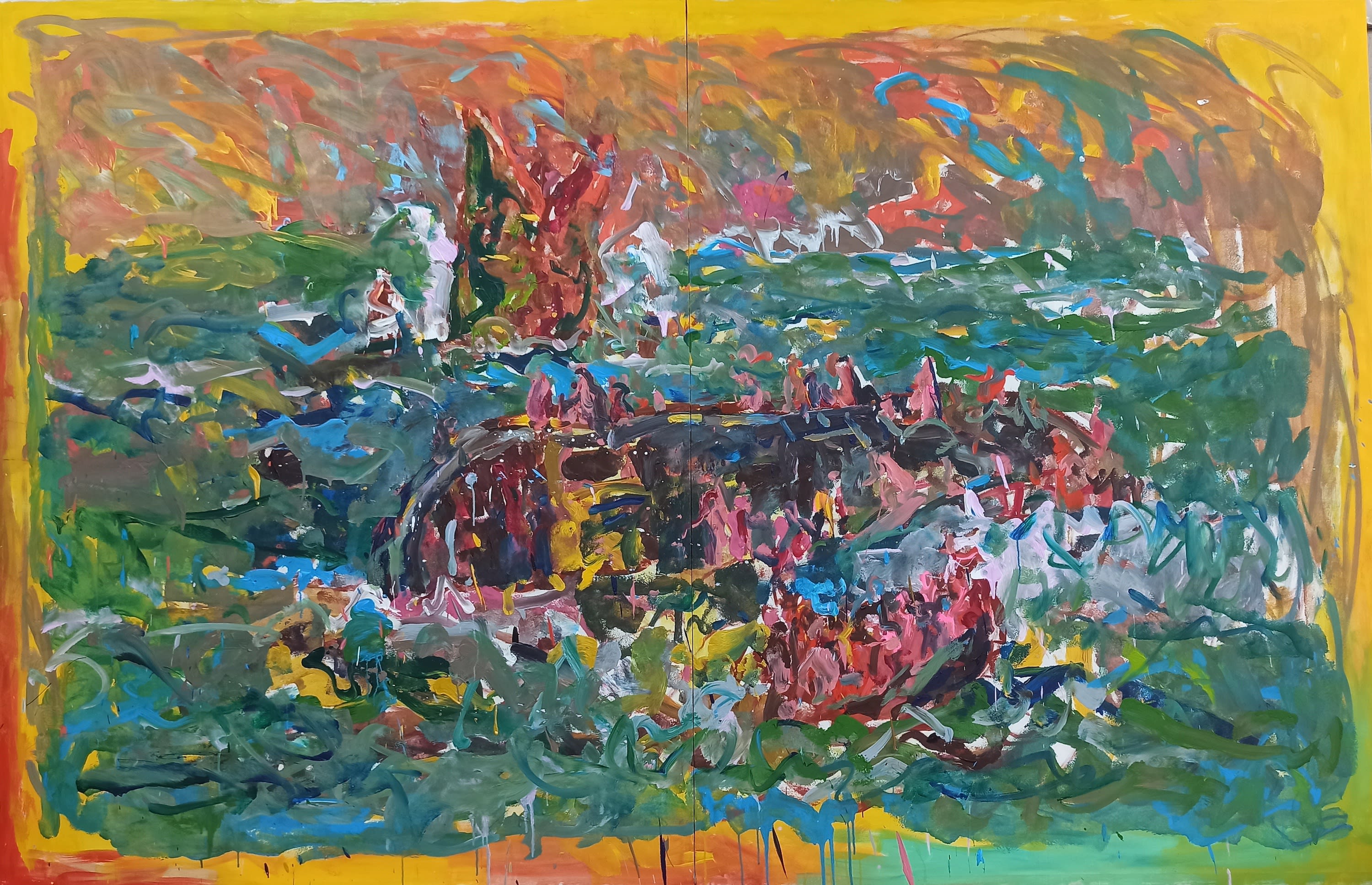 Their inaugural show, "The Red Room" (Dastan’s Basement, 2016), inspired, fueled, and shaped the dynamic of their subsequent collaboration. “Red Room 2: Migratory Birds” (Elga Wimmer Gallery, New York, 2017) focused on immigration, giving their work a more objective direction. "Blue Room" (V-Gallery, a Dastan:Outside Project, 2018) further underlines their affinity to the Caspian. The title of the current exhibition, "Darbedar-e Hamishegi,” is taken from a song of longing by a famous Iranian singer in exile. The artists listened to particular music ("Qalandar" or "Free-spirited") while working in their studio. The theme of migration (exile), appearing first in "The Red Room 2", evolves. If in their previous exhibitions, Ghasemi Brothers brought the whole expanse of land, water, and sky together, in their latest, they shift their angle of view meaningfully. Except for a single work (Untitled, 2023, acrylic on canvas, 160 by 180 cm) in which three figures are shown lounging among trees and beholding the beyond, the focal point of other works is the sky.