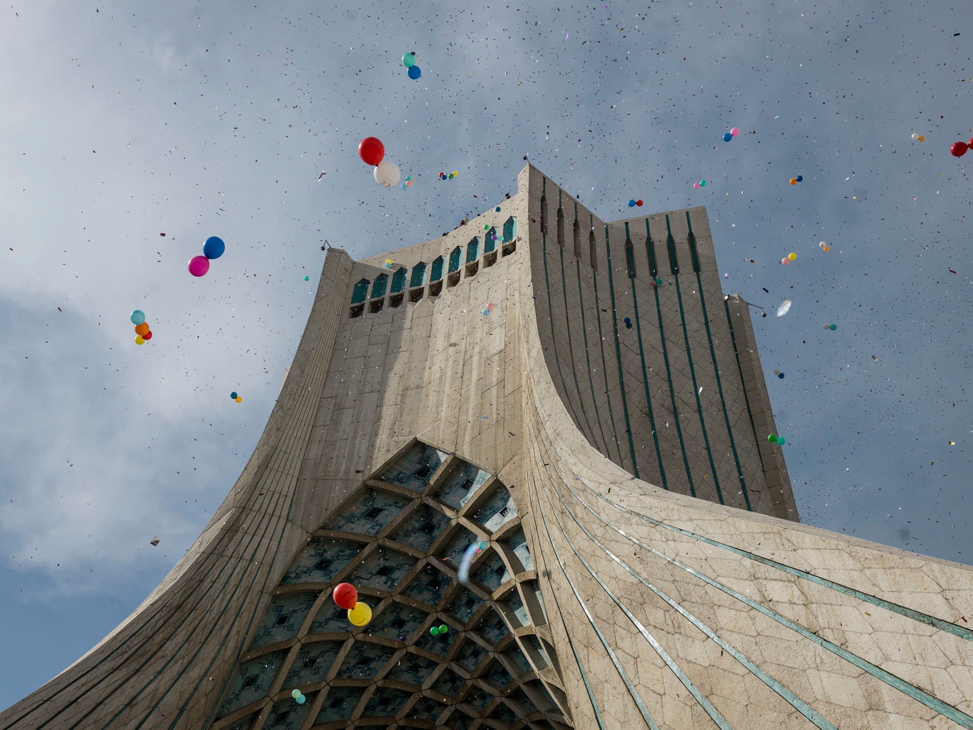 In Newsha Tavakolian’s work, “Iran, Freedom Sq.” (2015), Tehran’s most iconic landmark, Azadi [Freedom] Tower rises through vividly colored scattered balloons forming a configuration that appears like a rainbow.