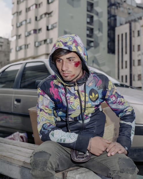 Sina Shiri (b. 1991) is a photographer whose work often falls into the field of street and urban photography. His portrayal of his subjects is usually at a moment considered a turning point in their day. This particular piece, “Untitled”: (2018), is part of his “Remains of the Day” series, first exhibited at Dastan’s Basement in June 2022. “Remains of the Day” examines the relationship between the city and its people, and the artist usually uses additional props to augment his themes and subject, moving away from mere documentary photography.